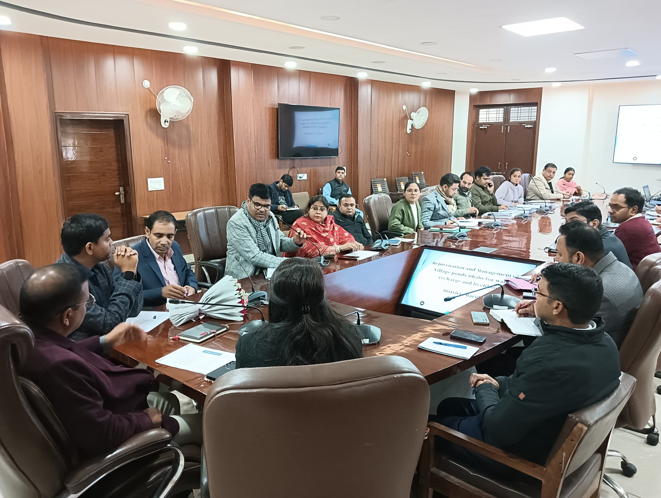 योजनाएं बनाने के साथ ही उन पर अमल करते हुए कार्य किया जाये ताकि आगामी मानसून सीजन में तालाबों में वर्षा का जल संग्रण किया जा सके। उन्होंने ब्लॉकवार लक्ष्य निर्धारित करते हुए कार्य योजना तैयार करने के निर्देश भी खण्ड विकास अधिकारी को दिये। उन्होंने राजस्व तथा ग्राम्य विकास विभाग से सम्बन्धित सूचनाएं निर्धारित प्रारूप पर शीघ्रता से उपलब्ध कराने के निर्देश सम्बन्धित अधिकारियों को दियें। उन्होंने निर्देशित करते हुए कहा कि पर्यावरण तथा पारिस्थितिकी से जुड़े इस महत्वपूर्ण कार्य में किसी भी प्रकार की समस्या न हो। बैठक में मुख्य विकास अधिकारी आकांक्षा कोण्डे ने निर्देशित करते हुए कहा कि यथार्थवादी कार्य योजना बनाकर तैयार की जाये ताकि योजना के कार्यान्वयन में किसी भी प्रकार की समस्या न हो। बैठक में सुधारीकरण हेतु आवश्यक आधारभूत जानकारियों, समस्याओं एवं चुनौतियों आदि के बारे में जानकारी देते हुए विभिन्न महत्वपूर्ण पहलुओ पर विस्तार से सुझाव दिये गए। इस दौरान मुख्य विकास अधिकारी आकांक्षा कोण्डे, परियोजना निदेशक केएन तिवारी, जिला विकास अधिकारी वेद प्रकाश, एसडीओ राजाजी टाइगर रिजर्व अजय लिंगवाल, सहायक निदेशक मत्स्य गरिमा मिश्रा, बीडीओ मानस मित्तल, आलोक गार्गेय,जगेंद्र राणा,पवन सैनी,अधिशासी अभियंता लघु सिंचाई विभाग विष्णु दत्त बेजवाल, आईसीआईसीआई बैंक से तरुण शर्मा आदि उपस्थित रहें।