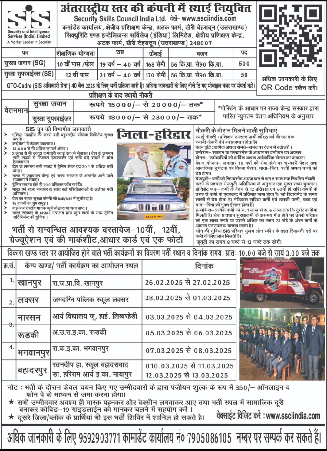 विदेशो में कर रही है। इस शिविर में सुरक्षा जवान , सुरक्षा सुपरवाइजर की नियुक्ति की जाएगी है। अतः शिविर का आयोजन विद्यालयों में तिथिवार आयोजित किया जाएगा जिसमें 26 फरवरी एवं 27 फरवरी को खानपुर ब्लॉक के राजकीय उच्च प्राथमिक विद्यालय खानपुर, 28 फरवरी एवं 01मार्च को लक्सर ब्लॉक के जमदागिन पब्लिक स्कूल लक्सर 03 मार्च एवं 04 मार्च को नारसन ब्लॉक के आर्य विद्यालय जूनियर हाईस्कूल लिब्बरहेड़ी, 05 मार्च एवं 06 मार्च को अटल उत्कृट राजकीय इंटर कॉलेज रूडकी, 07 मार्च एवं 08 मार्च को भगवानपुर ब्लॉक के राजकीय कन्या इण्टर कालेज भगवानपुर,10 मार्च एवं 11 मार्च को बहादराबाद ब्लॉक के रतनदीप हाईस्कूल बहादराबाद,12 मार्च एवं 13 मार्च को बहादराबाद ब्लॉक के डा0 हरिराम आर्य इण्टर कालेज मायापुर हरिद्वार में भर्ती शिविर के आयोजन की तिथि निर्धारित की गयी है। भर्ती अधिकारी विजय पाल मौर्या ने बताया है कि किसी ब्लॉक के अभ्यर्थी किसी भी ब्लॉक में भर्ती हो सकते हैं। भर्ती अधिकारी ने यह भी बताया कि भर्ती भारत पसारा एक्ट अधिनियम 2005 के अंतर्गत सुरक्षा सैनिक , सुरक्षा सुपरवाइजर पद के लिए शारीरिक माप दण्ड सुरक्षा जवान पद के लिए लम्बाई 168 सेंमी, सीना 80-85 सेंमी तथा उम्र 19 से 40 साल के बीच, वजन 55 से ज्यादा 90 से कम, योग्यता हाईस्कूल पास /फेल और शारीरिक एवं मानसिक रूप से फिट होना चाहिए। जहां सुरक्षा सुपरवाइजर के लिए 12 वीं पास एवं कम्प्यूटर का ज्ञान और लम्बाई 170 सेमी. उम्र 21 से 40 साल के बीच होना जरूरी है। जिसके लिए उन्होंने इच्छुक बेरोजगार युवको को उक्त निर्धारित तिथियों में अपनी सुविधानुसार संबंधित इण्टर कालेज में निर्धारित शिविर में भर्ती हेतु प्रतिभाग कर सकते है। जिसमें चयनित अभ्यर्थियों का पंजीकरण करने के लिए 350 रूपये आनलाइन व पे फोन के माध्यम से जमा करना होगा पंजीकृत चयनियत अभ्यर्थियो को प्रशिक्षण अथवा ट्रेनिंग के लिए एस0आई0एस0 ट्रेनिंग सेंटर देहरादून भेजा जायेगा। ट्रेनिंग पूरी होते ही युवाओं को रोजगार दिया जाएगा।